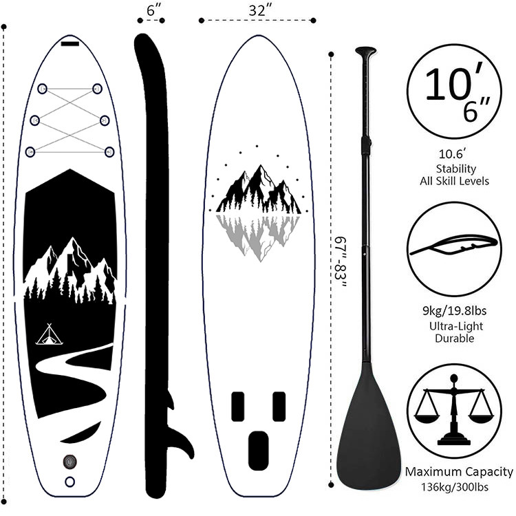 - PLACAS de PÁ INFLÁVEIS PARA ADULTOS - 10' 6" x 32" x 6" placas de pá infláveis para adultos com os acessórios completos do SUP caracterizam a construção a mais reforçada de 3 camadas e a maioria de projeto total manobrável-orientado. A placa de pá 16lbs inflável a mais leve tem uma capacidade de peso de até 350 libras, uma placa de pá do suporte de Huarui acima para que todos os nível de habilidade explorem, remem e aventurem-se em todas as áreas da água.